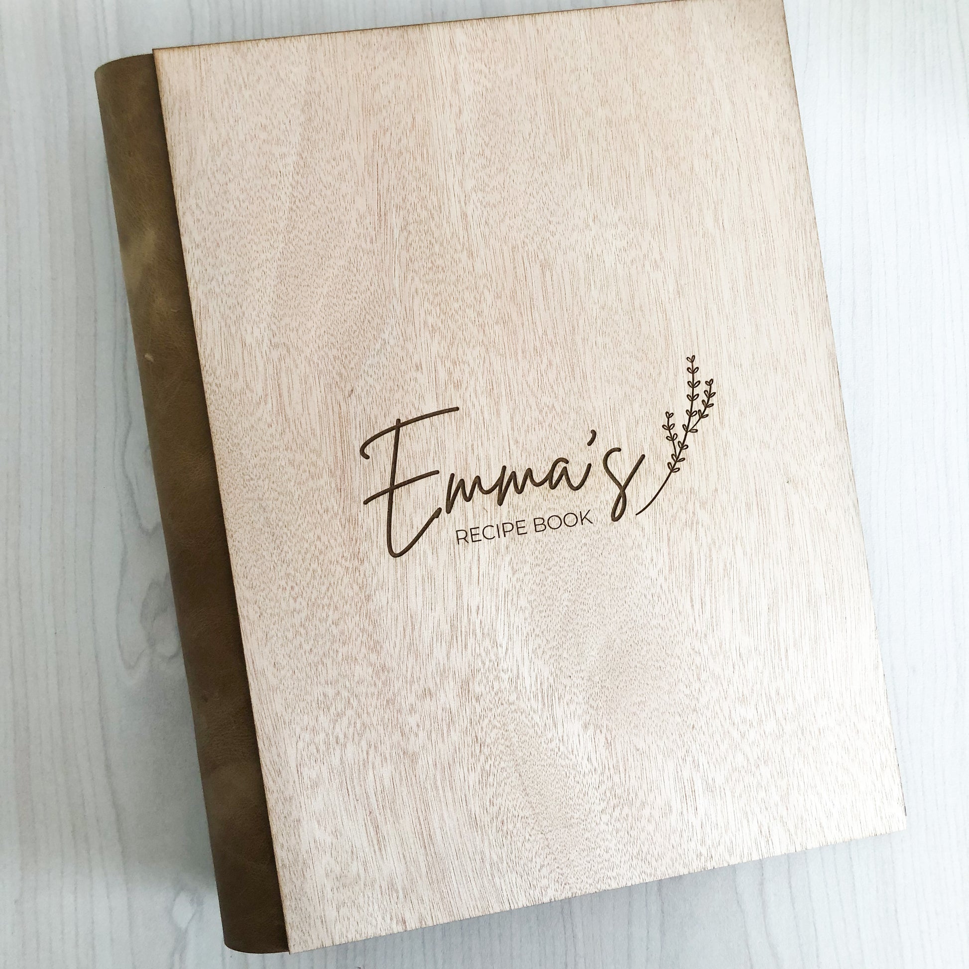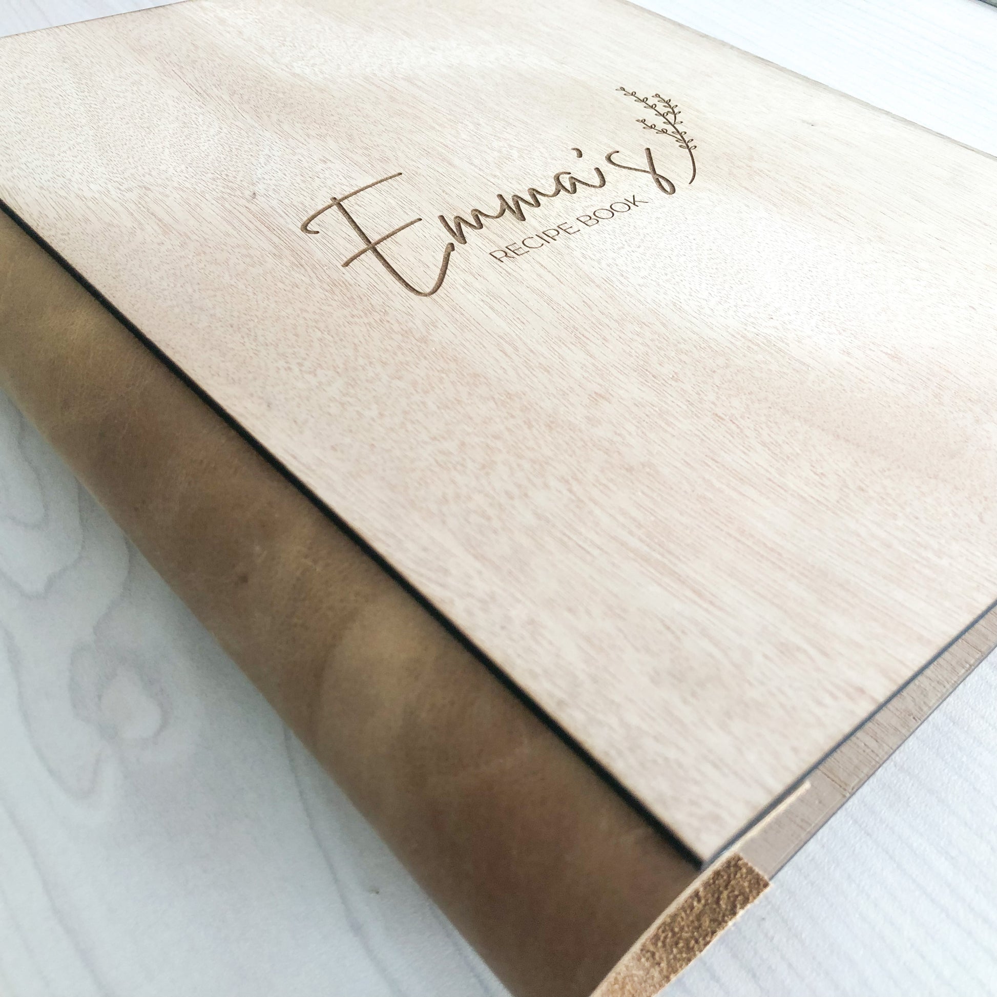 Beautiful A4 size wooden recipe cover with genuine leather and custom engraving and 2 pins inside to add your plastic sleeves to.