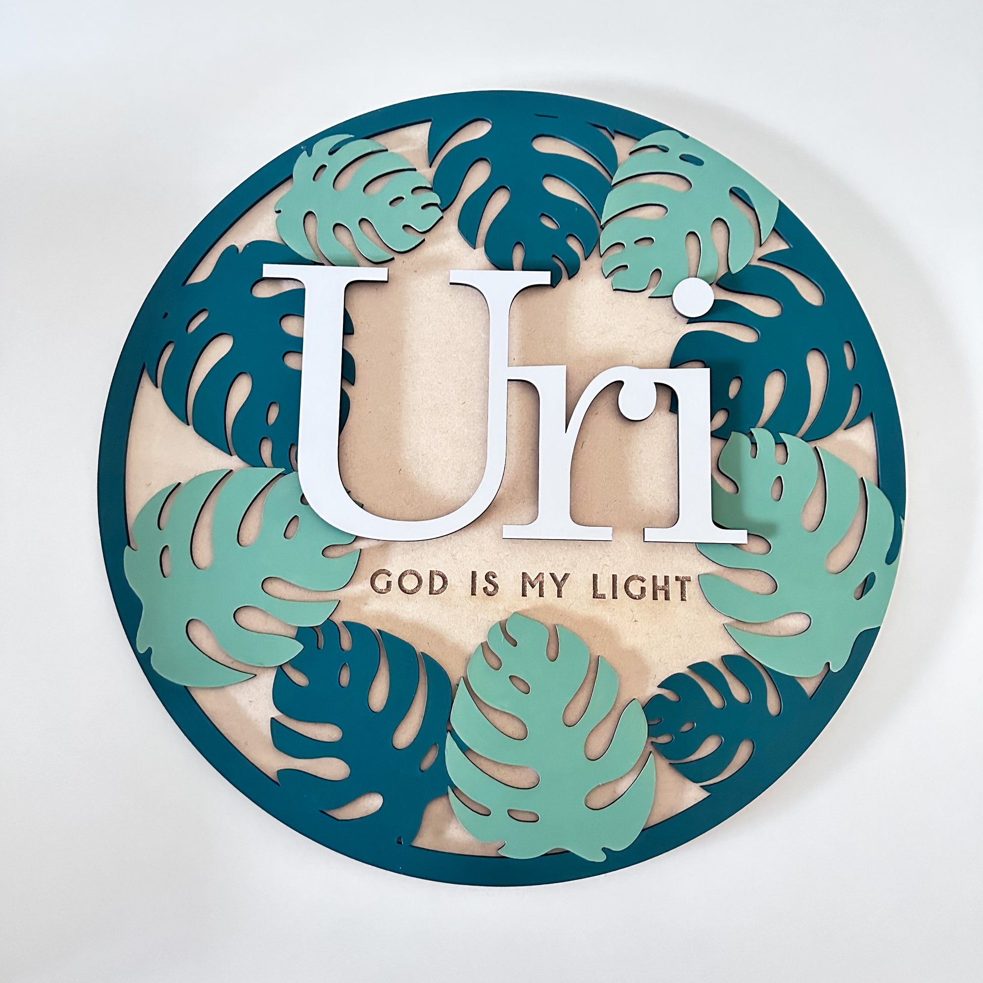 *triple layer (light wooden backing, painted leaf design, 3D name)
