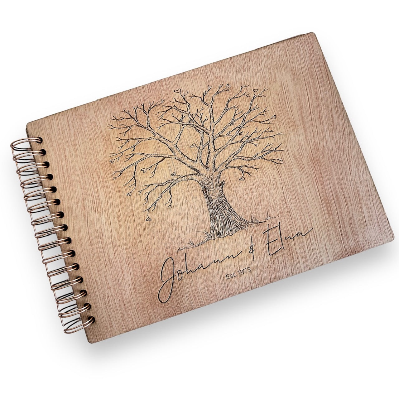 (Sample image has the light wooden cover with custom engraving and black blank pages)
