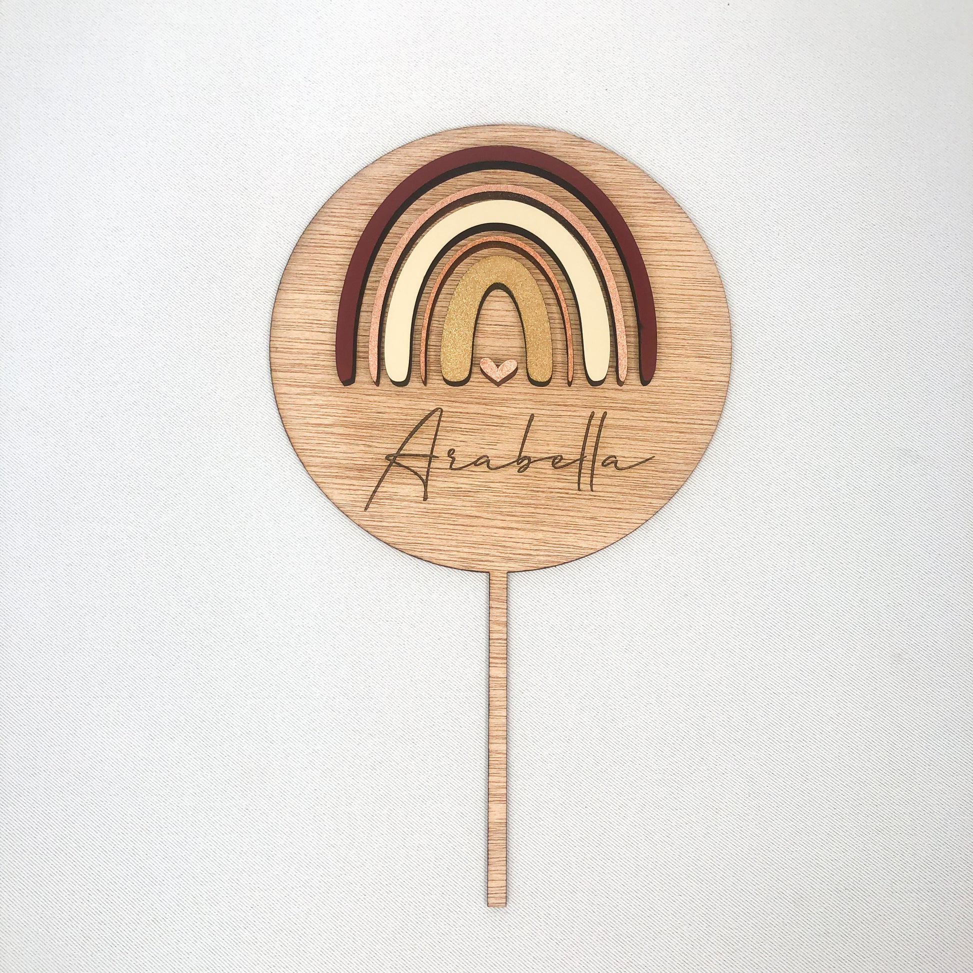 Beautiful 3D Rainbow cake topper with custom name engraved on the raw light wood.